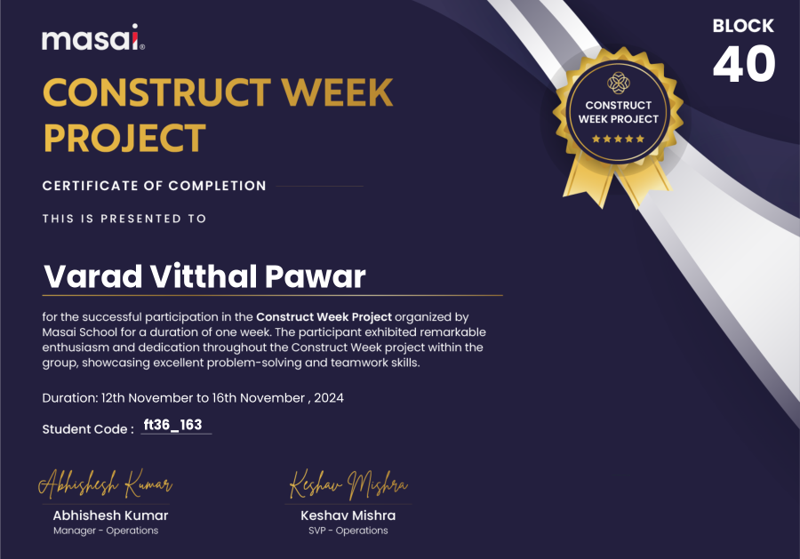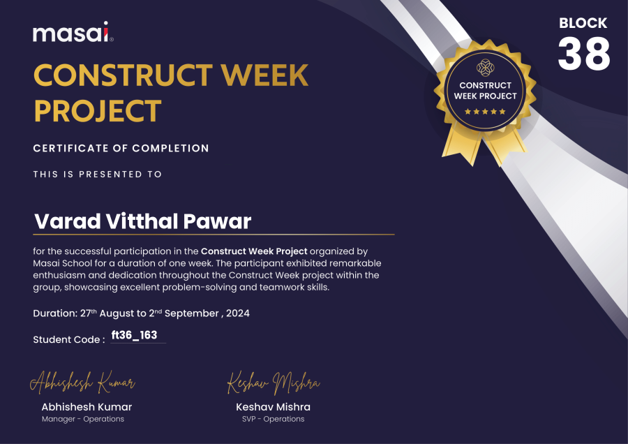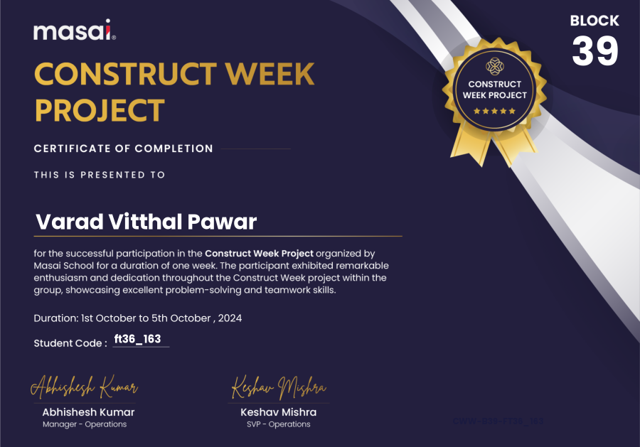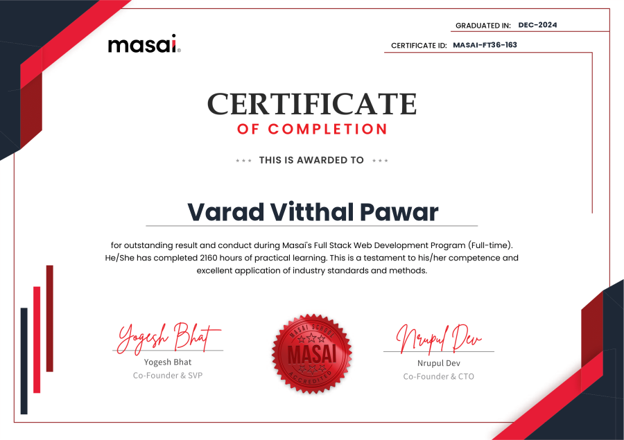 I completed the 7-month full-stack web development program at Masai School, where I gained hands-on experience in building web applications from scratch. The curriculum focused on industry-relevant skills, including front-end and back-end development, databases, and deployment. Throughout the program, I worked on multiple projects, honing my skills in technologies such as JavaScript, React, and more, preparing me to solve real-world challenges as a web developer.