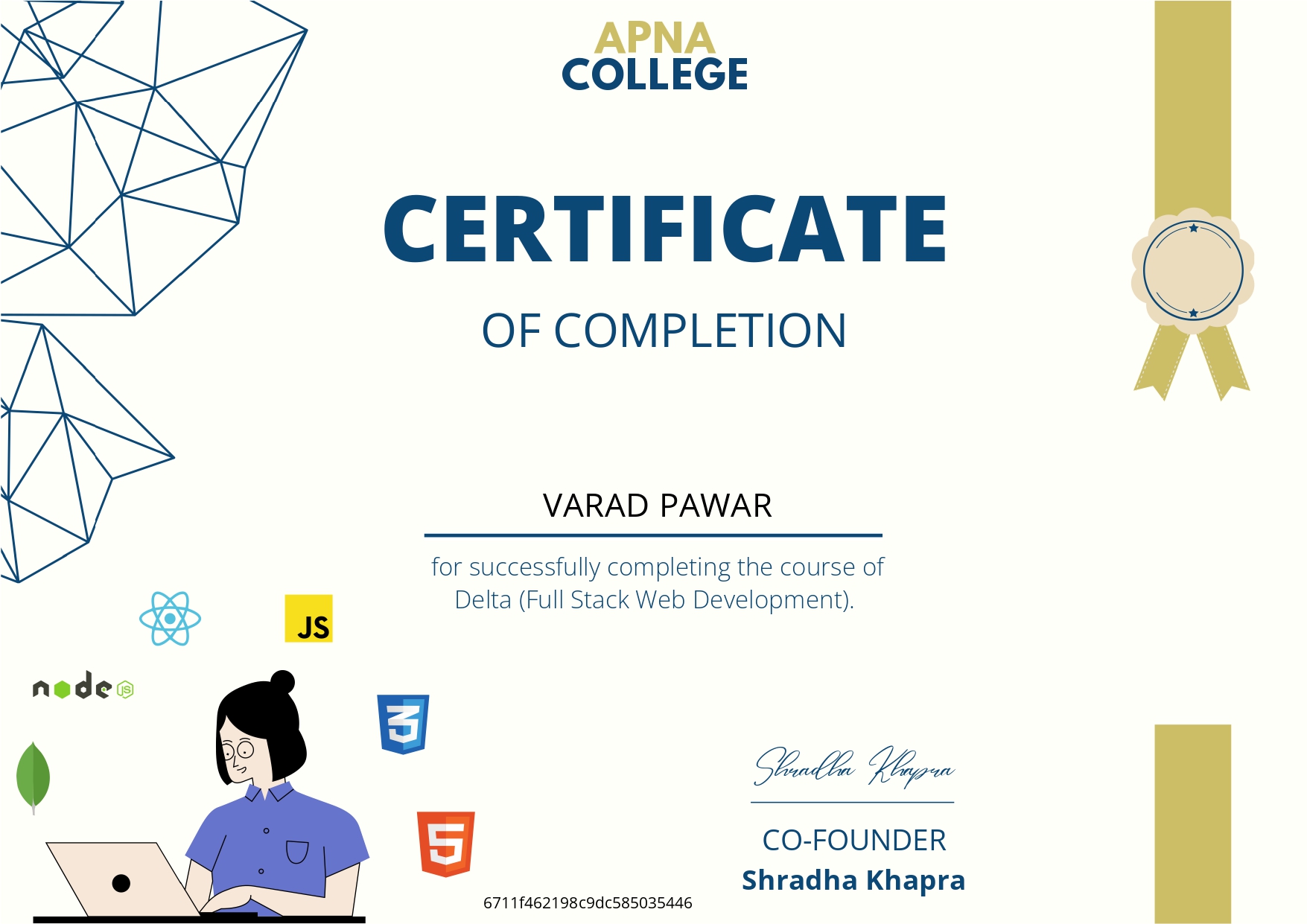 I completed a comprehensive 4.5-month full-stack web development program at Apna College, specializing in the MERN stack (MongoDB, Express.js, React, and Node.js). This program emphasized practical, project-based learning, allowing me to develop dynamic web applications with a focus on both front-end and back-end technologies. Through hands-on projects, I built a strong foundation in JavaScript, responsive design, and RESTful APIs, equipping me with the skills needed to create and deploy end-to-end web solutions.